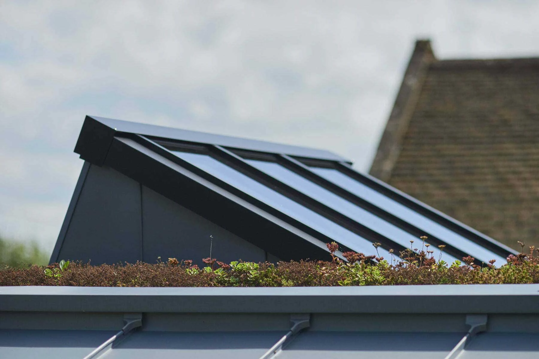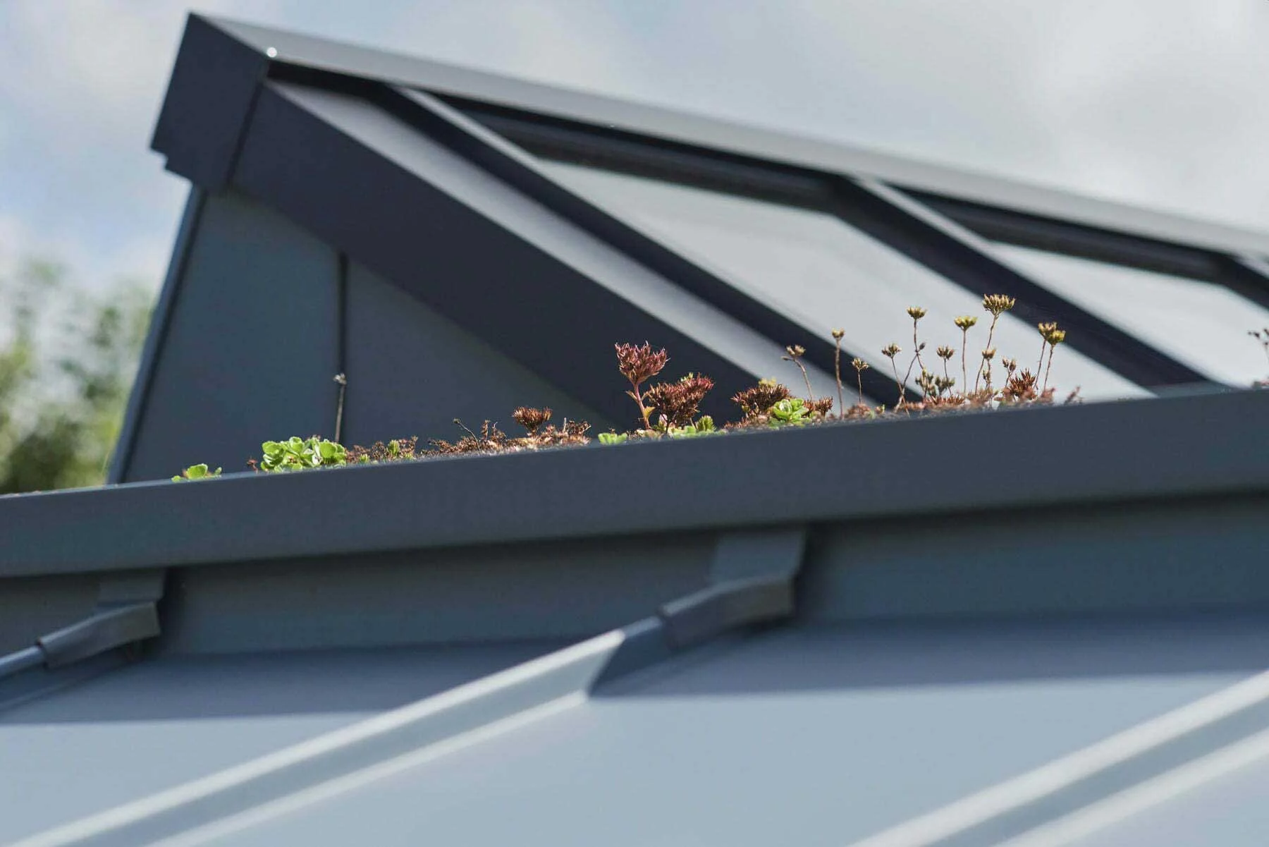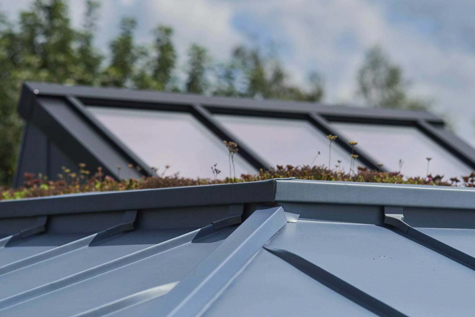 - Roofing: Standing seam zinc with integrated sedum garden roof