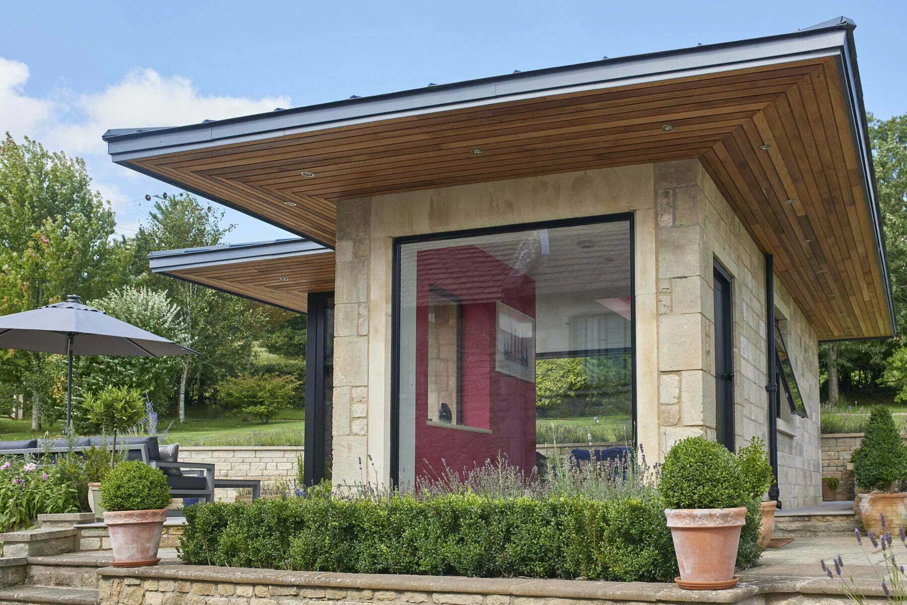 Full view of the standalone studio featuring limestone piers and a cedar-lined canopy.